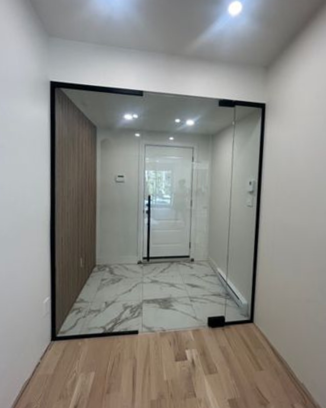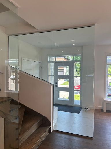 L'intégration d'un vestibule ou d'une paroi d'entrée en verre crée une transition à la fois élégante et pratique. Plus qu'un élément de design, ce mur de verre de haute qualité aide à réduire la perte de chaleur lorsque situé entre la portion intérieure et extérieure de votre espace, optimisant ainsi l'efficacité énergétique.